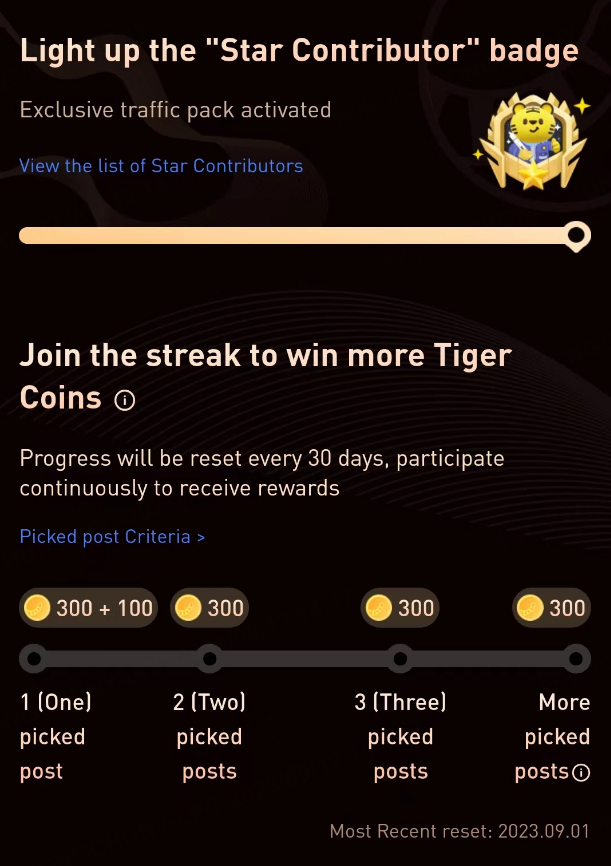 3, For the 1st Picked post by Star Contributor every month: 300 coins + extra 100 coins = 400 Tiger coins (100 coins more than normal users)