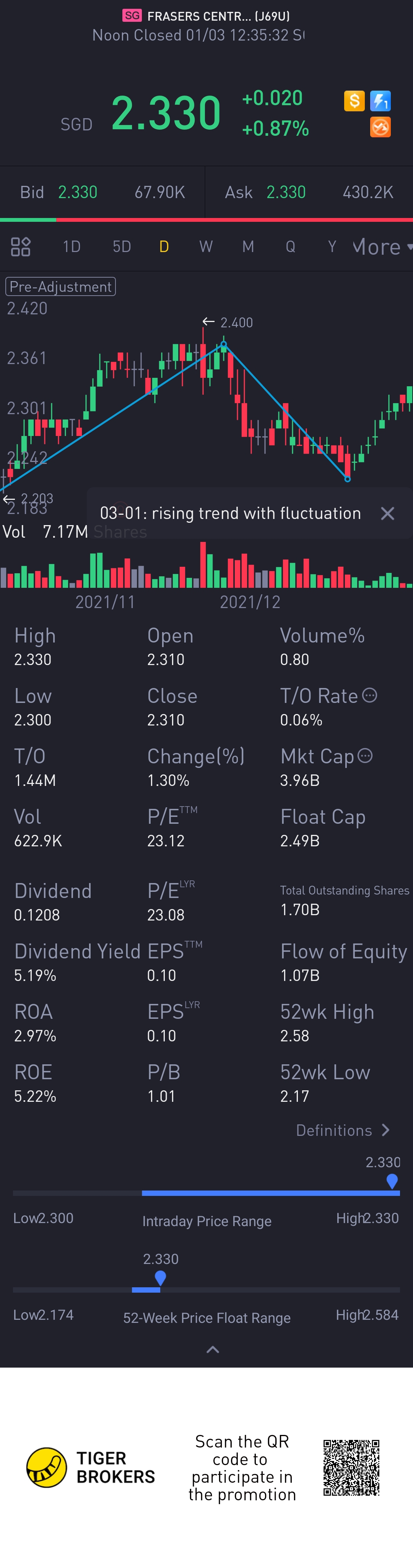This is one of my favourite reits listed here in Singapore. With a dividend yield of close to 5%, this is attractive enough for me to include this in my retirement portfolio. Lately price is moving up gradually. I believe its not difficult to notice the shopping mall traffic is almost back to normal. In fact the heartland mall were packed during the December month. Finally, we are very close to living with Covid.