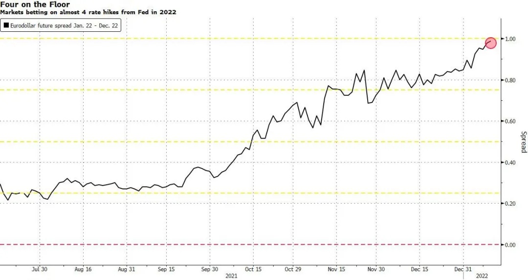 These four sentences, whether viewed horizontally or sideways, are undoubtedly hawks. Traders' bets also confirm this point. Eurodollar futures pricing currently predicts that the Federal Reserve will raise interest rates four times this year (compared with three times a day ago).