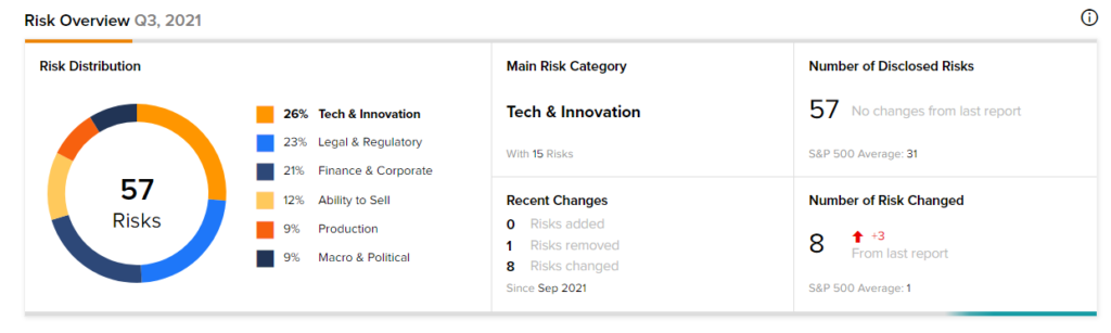 According to the new TipRanks Risk Factors tool, Novavax stock is at risk mainly from three factors: Tech and Innovation, Legal and Regulatory, and Finance and Corporate, which contribute 26%, 23%, and 21%, respectively to the total 57 risks identified for the stock.