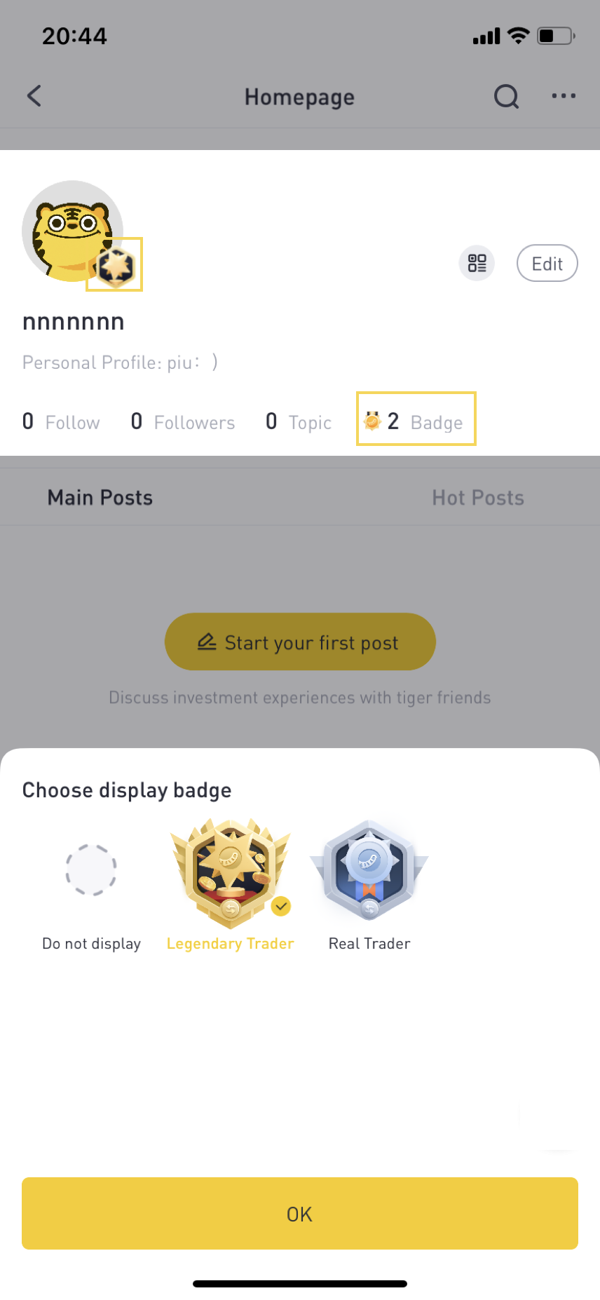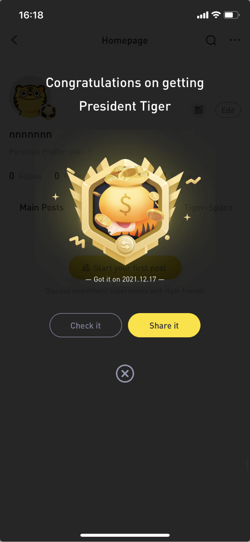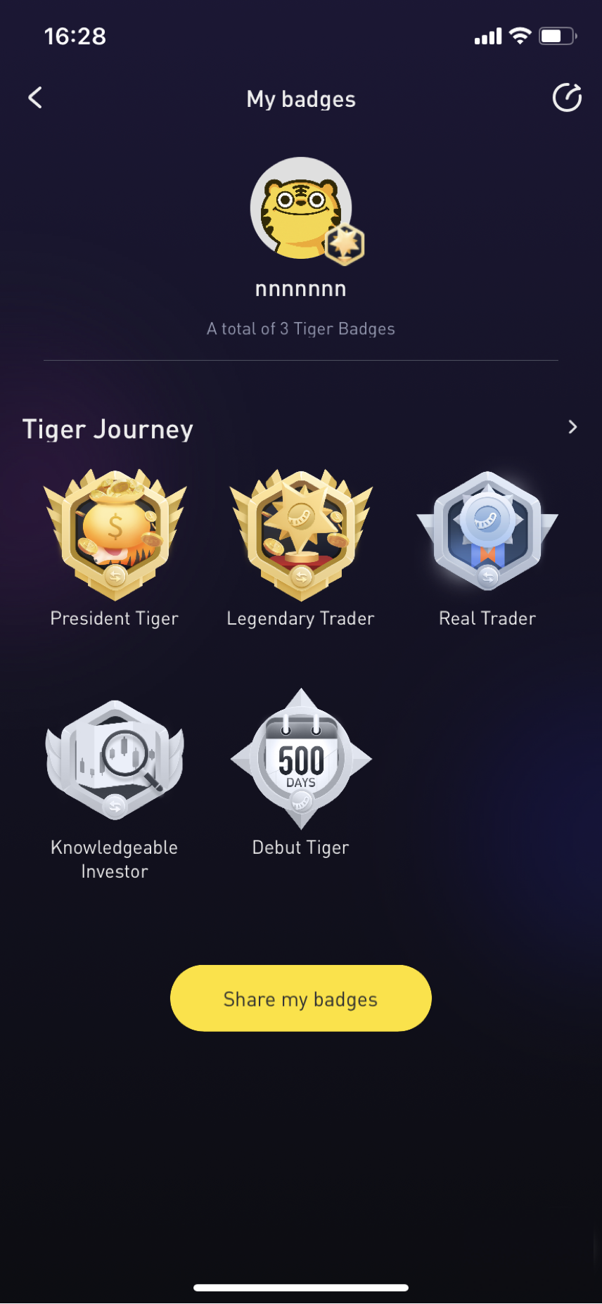 What is the Tiger Badge?In order to provide tiger users with a more friendly and interesting experience, we have launched the "tiger badge" in version 7.1.4.1.The "tiger badge" is a symbol of the honor a user has received, and it is also a testimony to the user's achievement.The badge system currently covers four dimensions, including Tiger Journey, Tiger Community, IPO series, and activity series, which correspond to users' transaction achievements, community contributions, participation in IPO, and irregular activities to obtain rewards.Some badges will distinguish levels. The higher the level, the more scarce and the more honorable.How to get and receive the Tiger Badge?In the badge function, we will provide users with a whole badge list, and support to view badge details. You can click on the badge entry on your personal homepage to jump to view your own or others' badge list.The following is a brief summary of the conditions for getting the tiger badge. The badge description on the details page is also convenient for everyone to check the rules at any time.