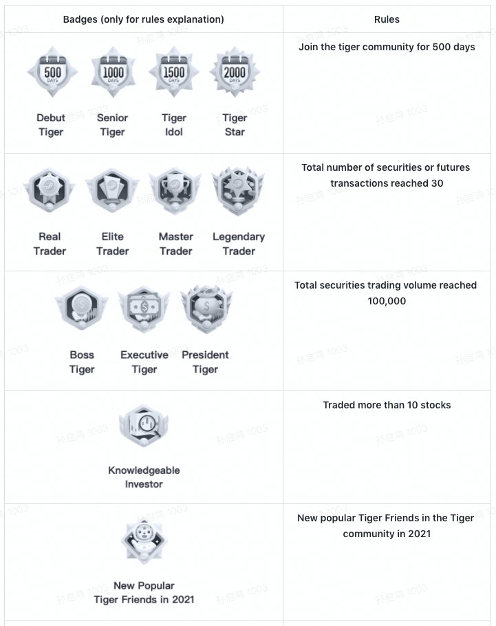 Looking back at the investment path you have taken in Tiger, do you feel a sense of accomplishment? Don’t worry about tiger users who have not yet gotten the tiger badge. As Buffett said, “No matter how much talent you have or how much effort you put in, certain things just need time to accumulate.”Badges are a symbol of honor and status. Hurry up and check how many tiger badges you have already gotten. There may be surprise for you. Remember to share with tiger friends.Collect all the tiger badges, and there are more surprises waiting for you. If you have any expectations for the rights and interests of the badges, please comment to us. ^_^