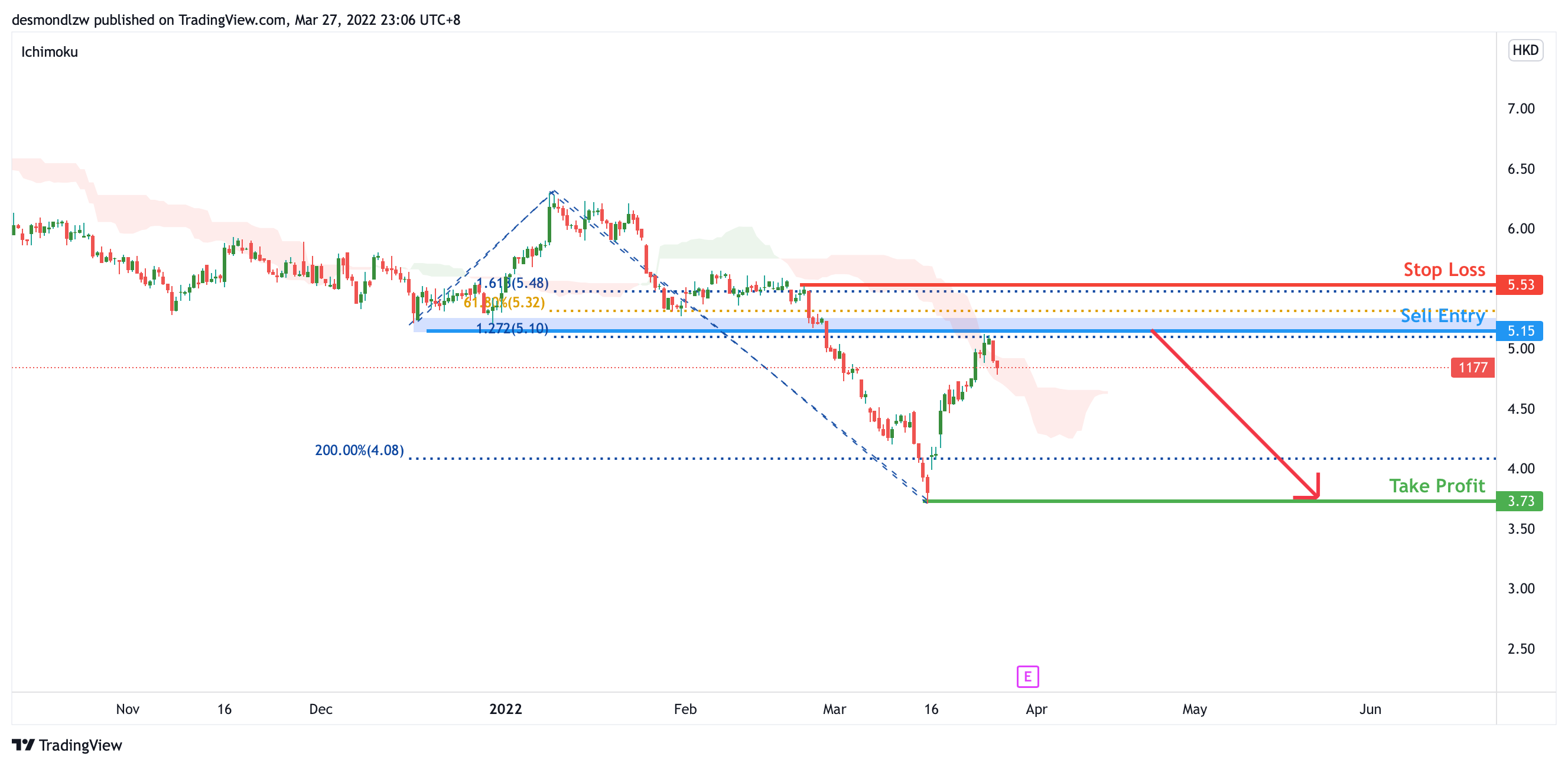 Looking to get in at the sell entry @ 5.19 in line with 127.2% Fibonacci extension. Probably going to short to 3.73 in line with 200% Fibonacci projection. I'll have my stop loss potentially at 5.53 in line with 161.8% Fibonacci projection. Prices are trading below the ichimoku clouds, further supporting our bearish bias.
