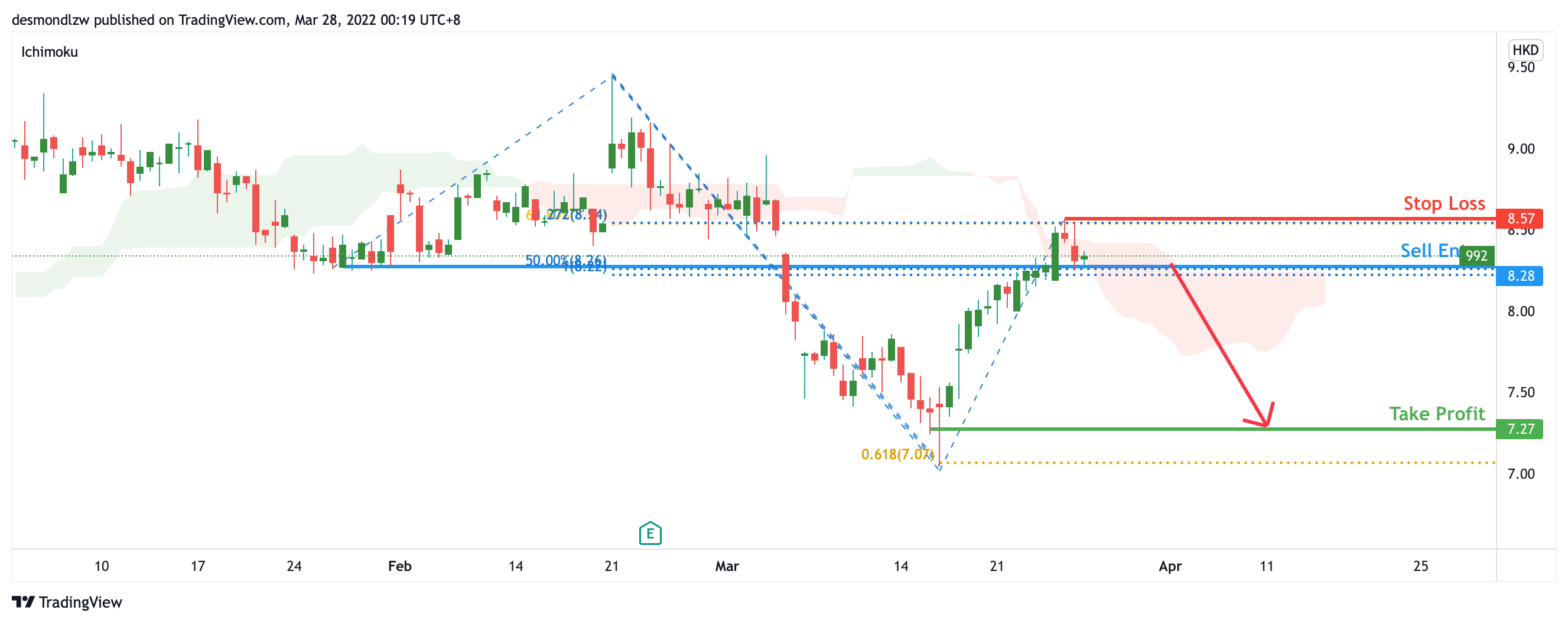 Prices are on bearish momentum. We see the potential for further dips to get in a sell entry @ 8.28 in line with which is an area of Fibonacci confluences. Probably going to short to 7.27 in line with 61.8% Fibonacci retracement and also a graphical swing low. I'll have my stop loss potentially at 8.57 in line with 61.8% Fibonacci projection and 50% Fibonacci retracement. Prices are trading below the ichimoku clouds, further supporting our bearish bias.