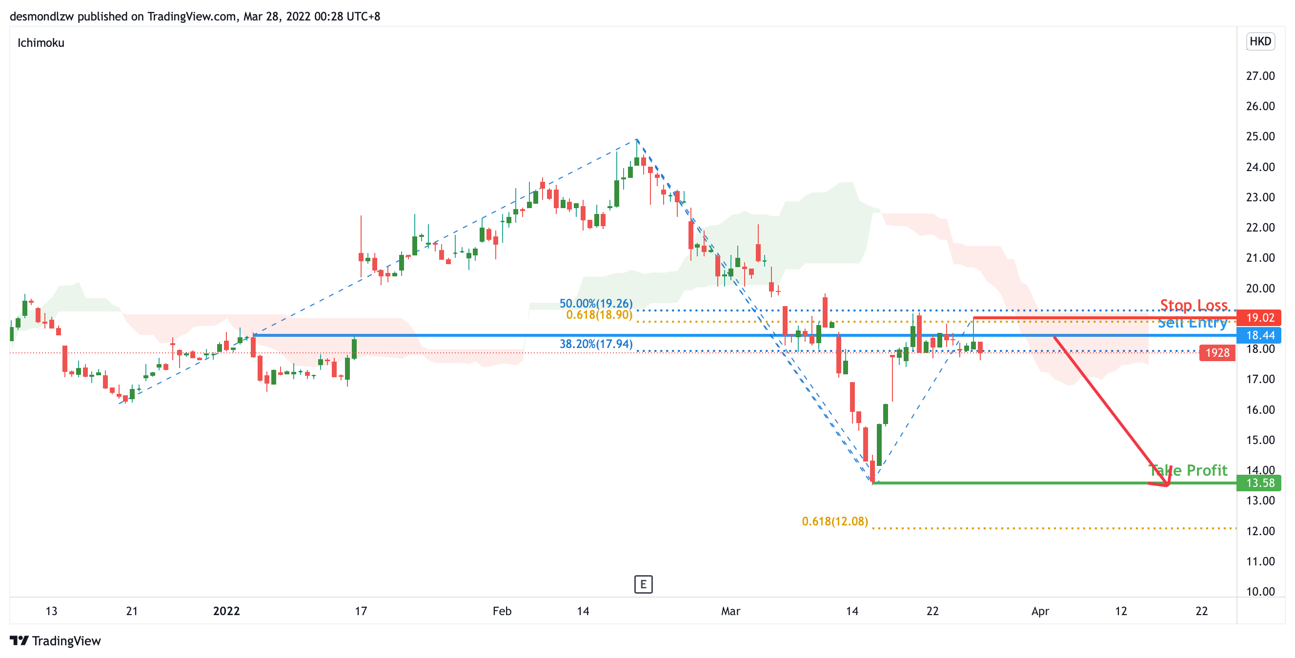 Prices are on bearish momentum. We see the potential for further dips to get in a sell entry @ 18.44 in line with which is an area of Fibonacci confluences. Probably going to short to 13.58 in line with 61.8% Fibonacci retracement and also a graphical swing low. I'll have my stop loss potentially at 19.02 in line with 61.8% Fibonacci projection and 50% Fibonacci retracement. Prices are trading below the ichimoku clouds, further supporting our bearish bias.