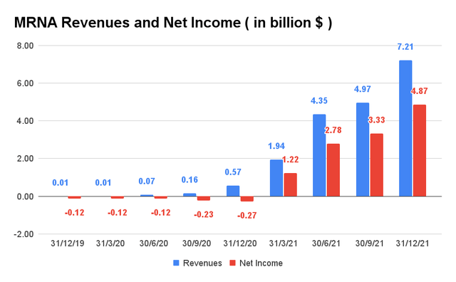 Due to the global success of its COVID-19 vaccine, Spikevax, MRNA reported blockbuster revenues of $18.47B in FY2021, representing YoY growth of 2300% from $803M in FY2020. Its Net Income margin is obviously also fat at 66.1% for the latest fiscal year. In FQ4'21, the company also reported excellent revenues of $7.21B, representing a 45% increase QoQ.