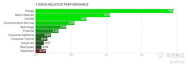 10 sectors ended the week in positive territory with energy (+7.8%), materials (+4.2%), and utilities (+2.9%) leading the way while healthcare (-0.59%) recorded a slight loss after outperforming earlier this month.