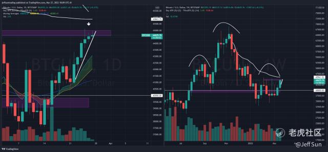 $BTCUSD has reflected rally exhaustion price action pattern from its past 6 sessions of gain. There is lowering in trading ranges, intraday price action struggling to close at its high, and price action getting rejection from $45,000 pivot level.
