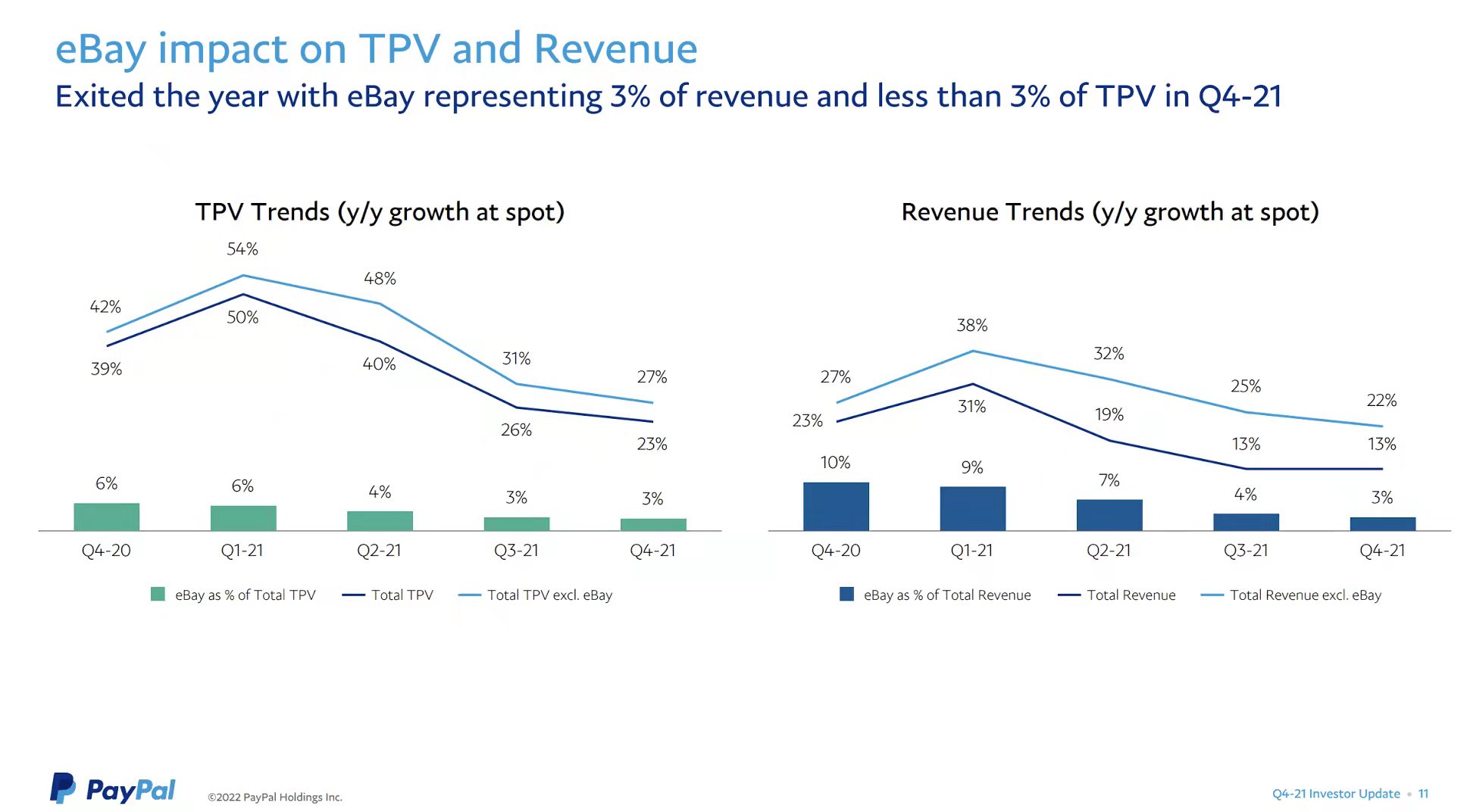 At the time, eBay was still close to 10% of total revenues. Over the last couple of years, eBay has moved to a new payments system stripping PayPal from the business and causing a major headwind to the TPV trends. Not to mention, eBay saw a major boost in volumes due to Covid pull forwards.