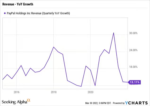 The combination of losing peak eBay volumes with Covid pull forwards from their other revenue sources is exasperating the trends and making the current PayPal business appear far worse than reality. After all, the company would've reported a dip in revenue growth from a peak of 38% in Q1'21 to a forecast for only 14% in Q1'22.