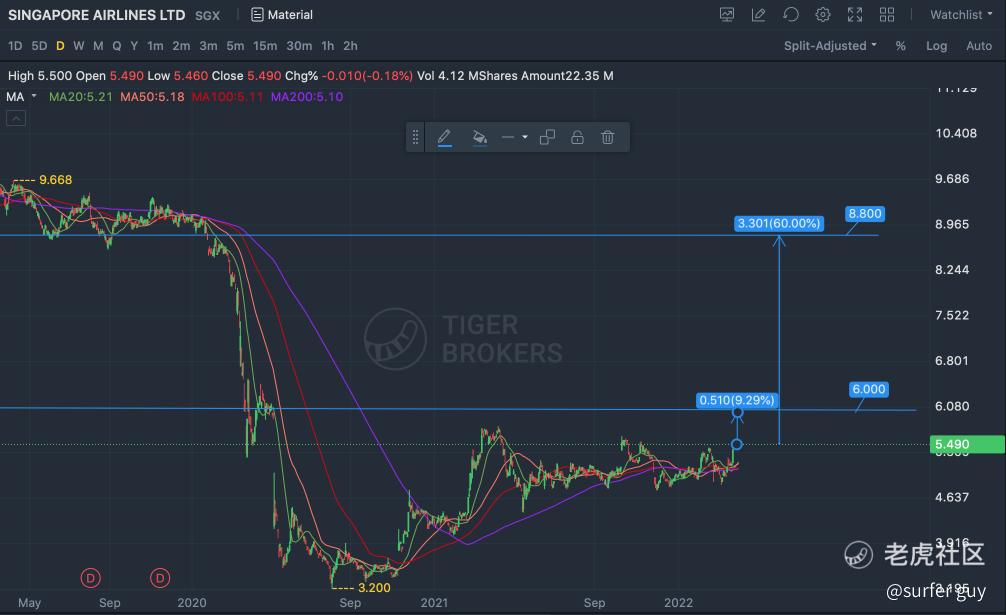 First target to aim for is $6, an ambitious +9.29% gain. It might be reachable as the $Straits Times Index(STI.SI)$ gain for 2021 was +13%. Even though we expect slower growth in 2022 with high inflation, energy cost, geopolitical and lingering pandemic headwinds, resumption of quarantine-free international travel might just be the tailwind for SIA and her aviation peers to propel upwards again.