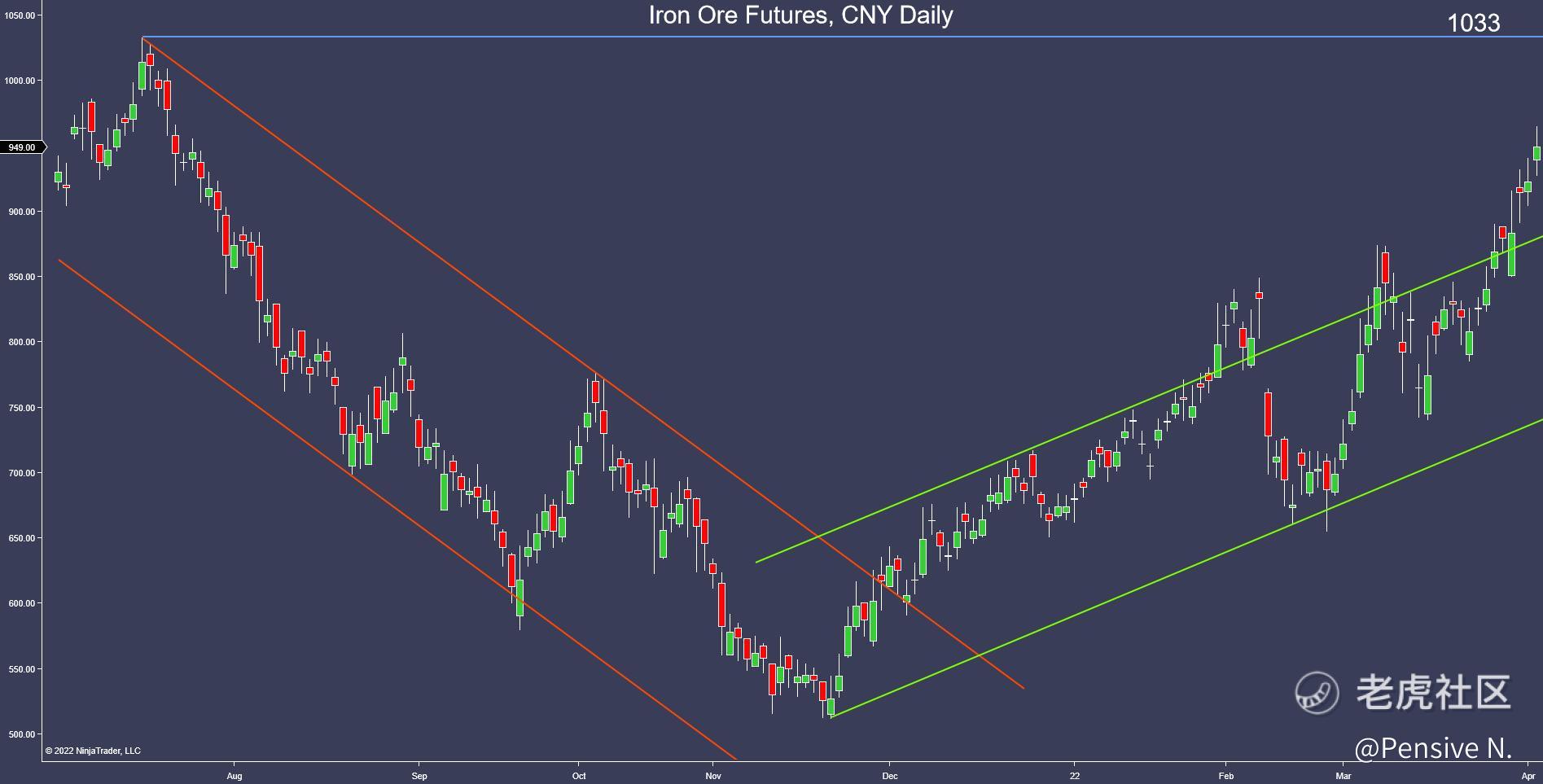 - Iron ore continues to rally strongly, and is approaching last July’s high at 1033