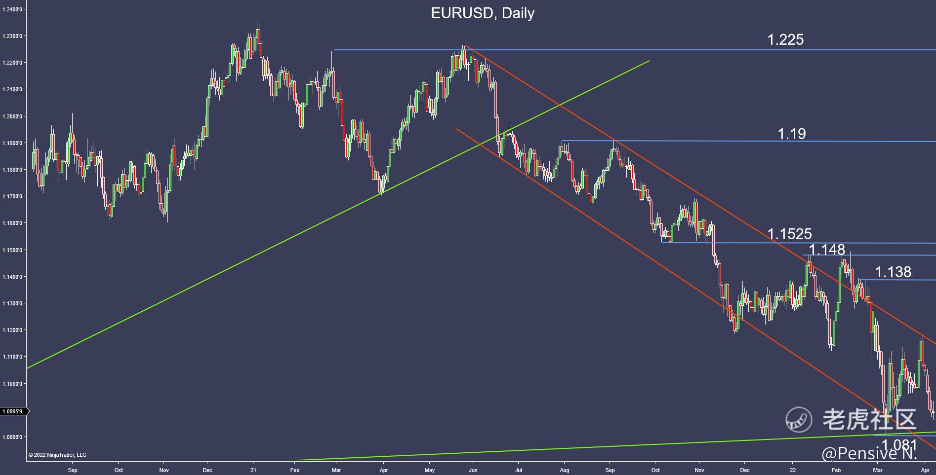 - EUR has fallen back to ~1.09 after its end of 1Q22 rally