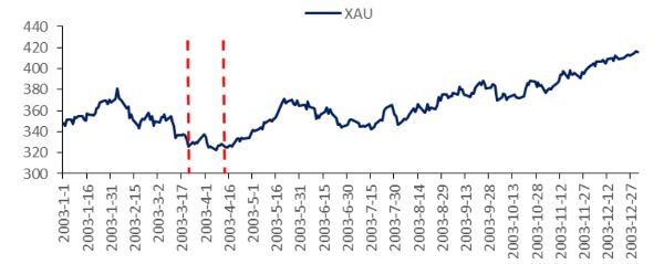 2003年3月20日,美英聯軍向伊拉克發動空襲和地面攻勢,主要避險資產中,黃金價格略有上漲。2003年4月15日,聯軍控制伊拉克,黃金價格上漲。