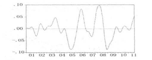 通過利用HP濾波法測定的國際黃金價格的波動週期。我們發現,2001-2011年國際黃金價格波動頻繁,其中2005年6月、2006年6月、2008年3月和 12月份爲異常波動,波動幅度比較大,分別爲-8.8%,8.3%,9.8%和-8.7%。國際黃金價格平均的波動率約在-1.5%-1.5%。