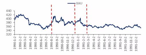 海灣戰爭(Gulf War),是以美國爲首的多國部隊於1991年1月17日~2月28日在聯合國安理會授權下,爲恢復科威特領土完整而對伊拉克進行的局部戰爭。1990年8月2日,伊拉克佔領科威特,主要避險資產中,黃金價格上漲。1991年1月17日海灣戰爭爆發,黃金價格下跌。