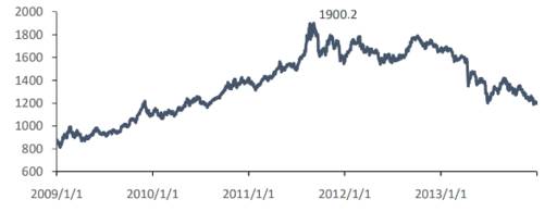 歐債危機是美國次貸危機的延續和深化,其本質是歐元區統一的貨幣政策與未能統一的財政政策帶來的地區分化。在歐債危機最嚴重的階段,黃金價格一路飆升,從2009年底的1068美元/盎司上升至1900美元/盎司。