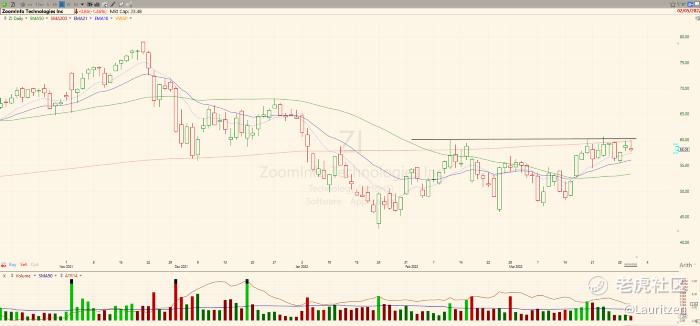 ZoomInfo ($$(ZI)$) seems the buyers and sellers shake hands since there is no volatility now, ATR declining, low volumes. If the price is above the black line, the long position might work. Stop Loss at EMA21.
