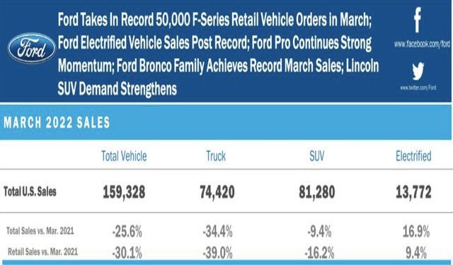 Ford's March sales in the U.S. capitulated by 25.6%. The company's year-over-year truck sales have now decreased by 34.4%, and its car and SUV sales also decreased by 67% and 9.4%, respectively. However, the firm managed to build on its EV momentum by clearing a 16.9% increase in its sector growth versus the previous year.
