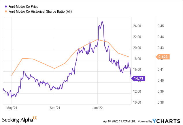 The final matter to consider here is that Ford's Sharpe ratio has decreased dramatically during the turn of the year. Although a lagging indicator, the Sharpe ratio still adds substance to risk-reward judgment, and you usually want to see a Sharpe Ratio of above 1.00 as an investor.