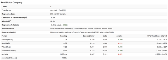 I ran Carhart's 4-factor model in Portfolio Visualizer to see whether I could find out more about the market circumstances that drive Ford's returns. I know the image is a bit blurry, but just enlarge it by clicking on it, and you'd be able to see it more clearly.
