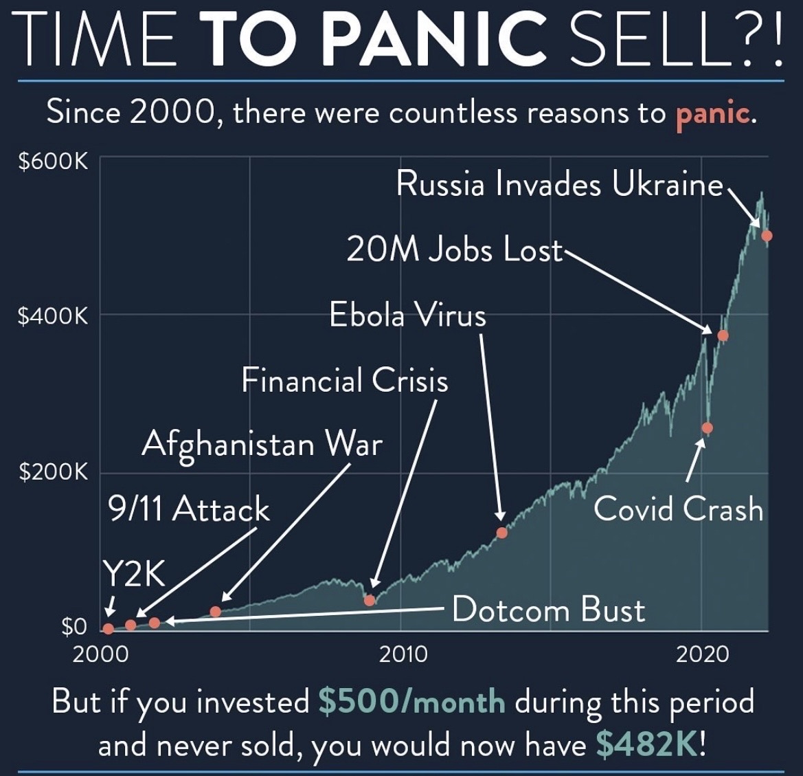 Since 2000 there were so many reasons to panic and get out of the market in cash. OR just stay calm be invested.