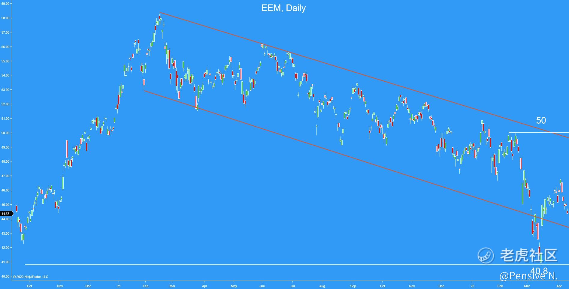 - EEM fell along with US and European stocks, and its mid March rally looks to be over