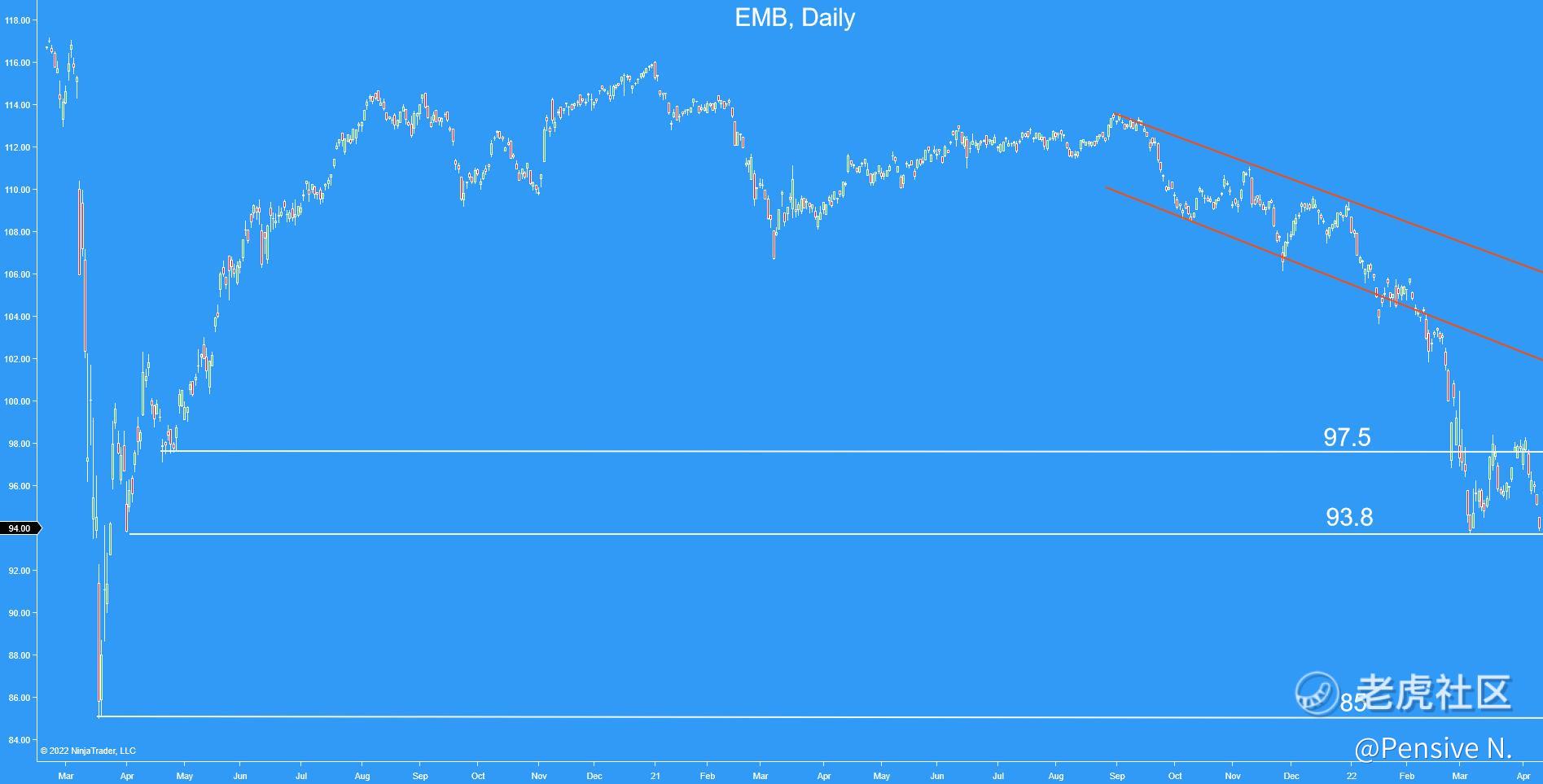 - EMB is testing major support, a break of which could also see it fall to its COVID lows