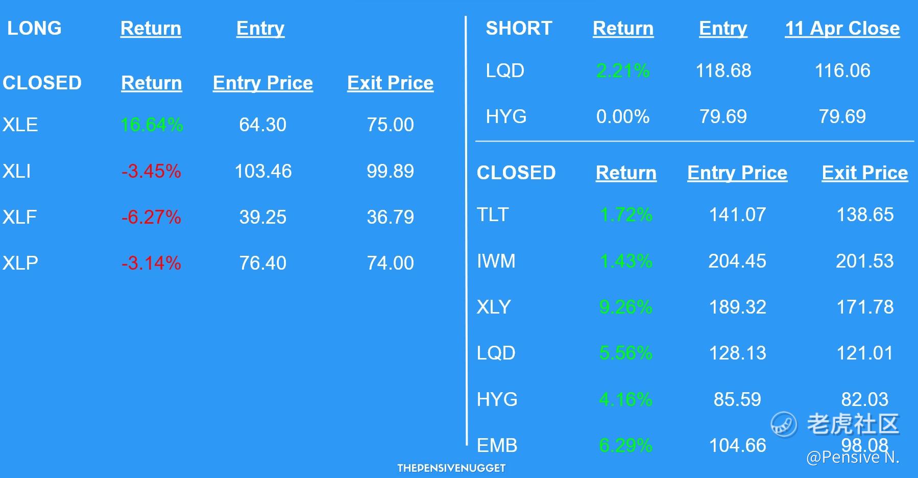 - Exited LQD for a gain of 5.56%, HYG for a gain of 4.16%, and EMB for a gain of 6.29%