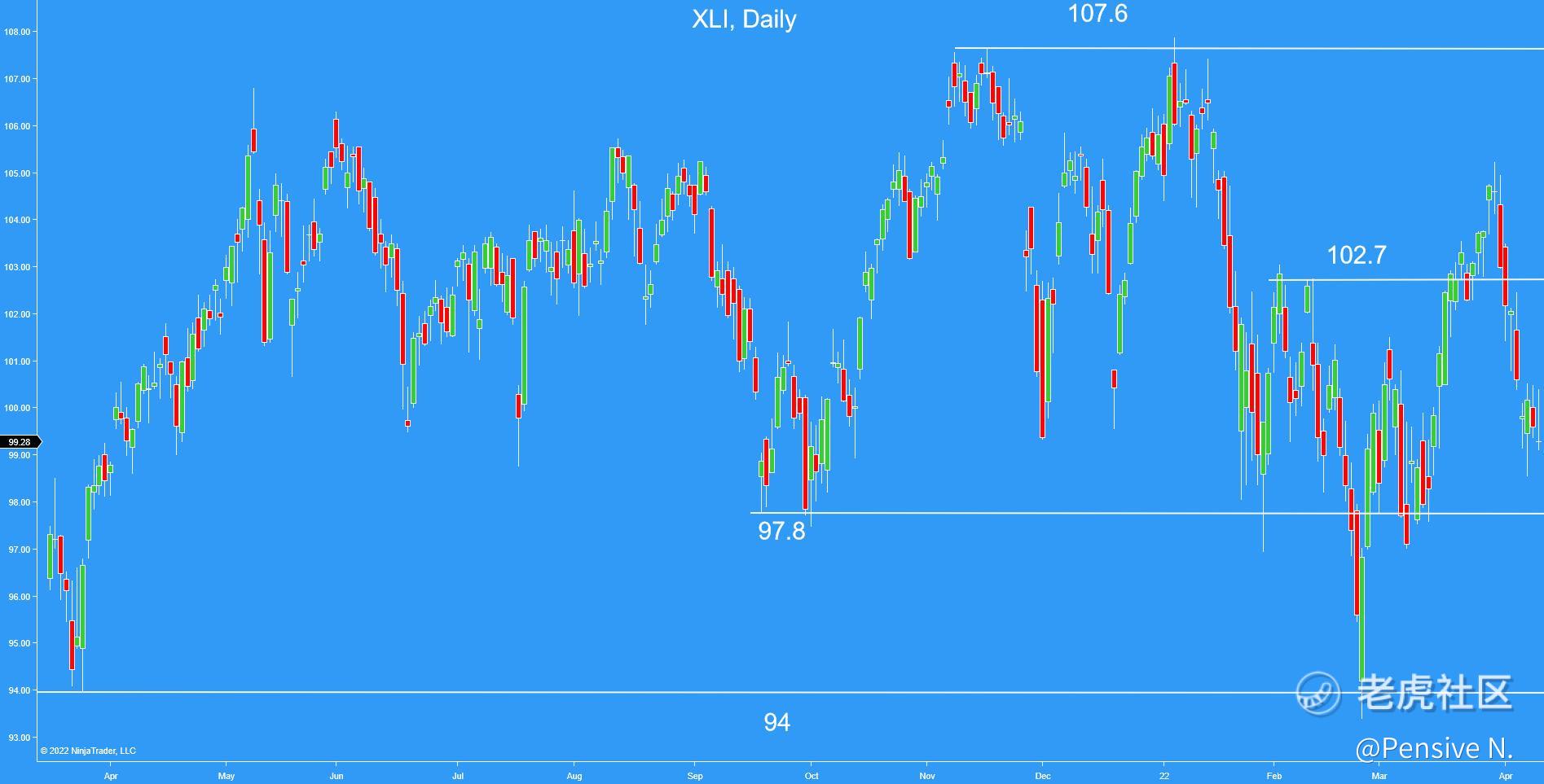 - XLI’s sharp reversal below $102.7 at the end of March did indeed signal the end of its bounce, at least for now, as Industrials tumbled to close in on $97.8 support