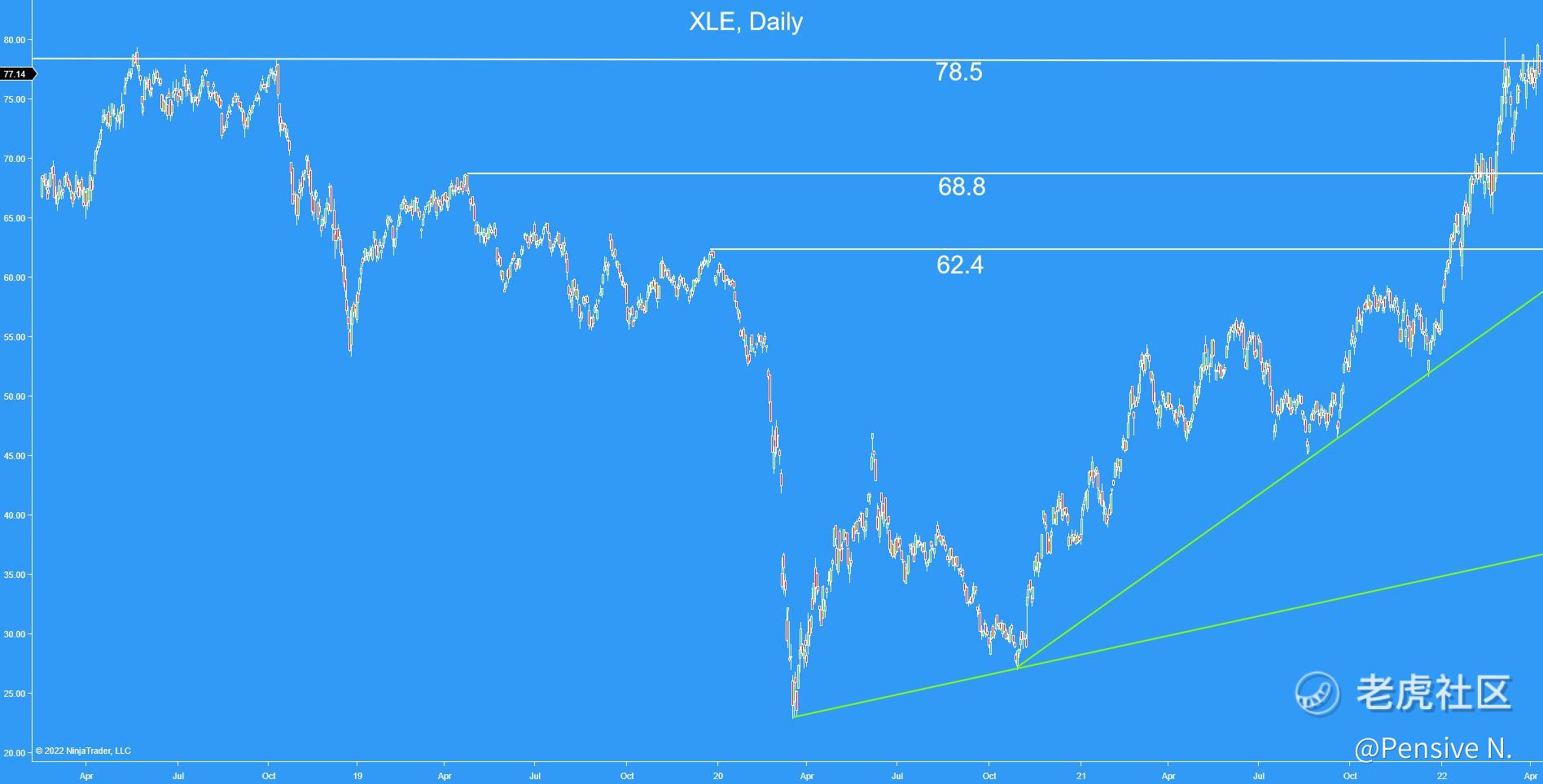 - XLE is still trading sideways close to its quadruple top ~$78.5, even as WTI fell below $100 again