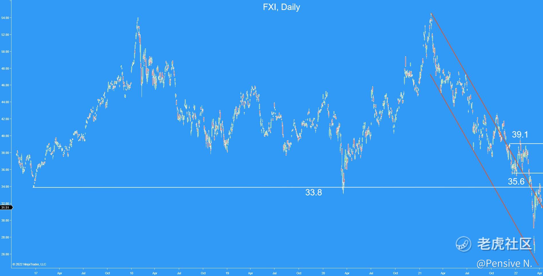 - FXI’s break above $33.8 turned out to be extremely short lived, as it has now almost fallen back into its bearish channel