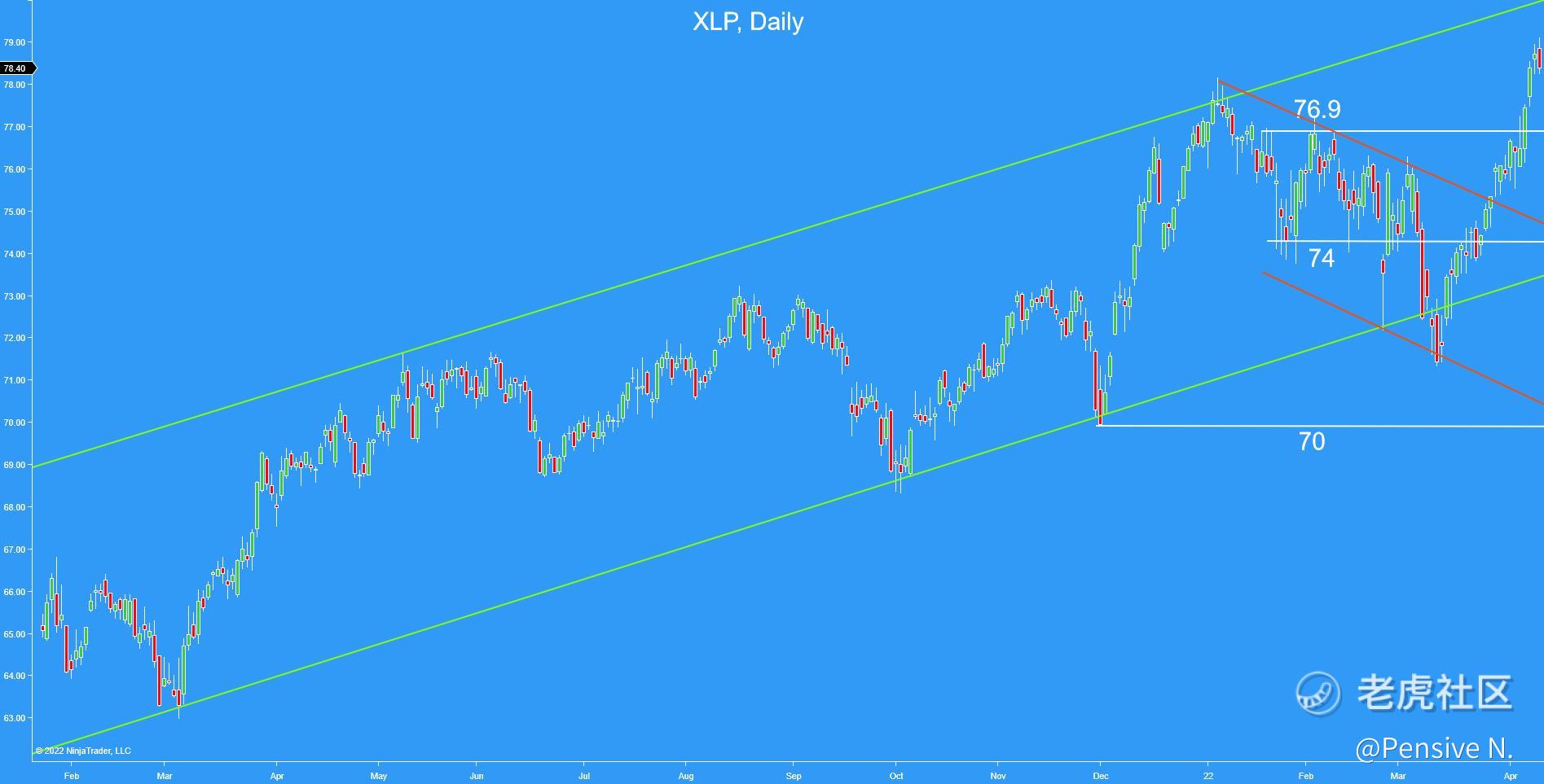 - XLP has decisively broken out of $76.9 resistance, and is now trading above its Jan highs ~$78