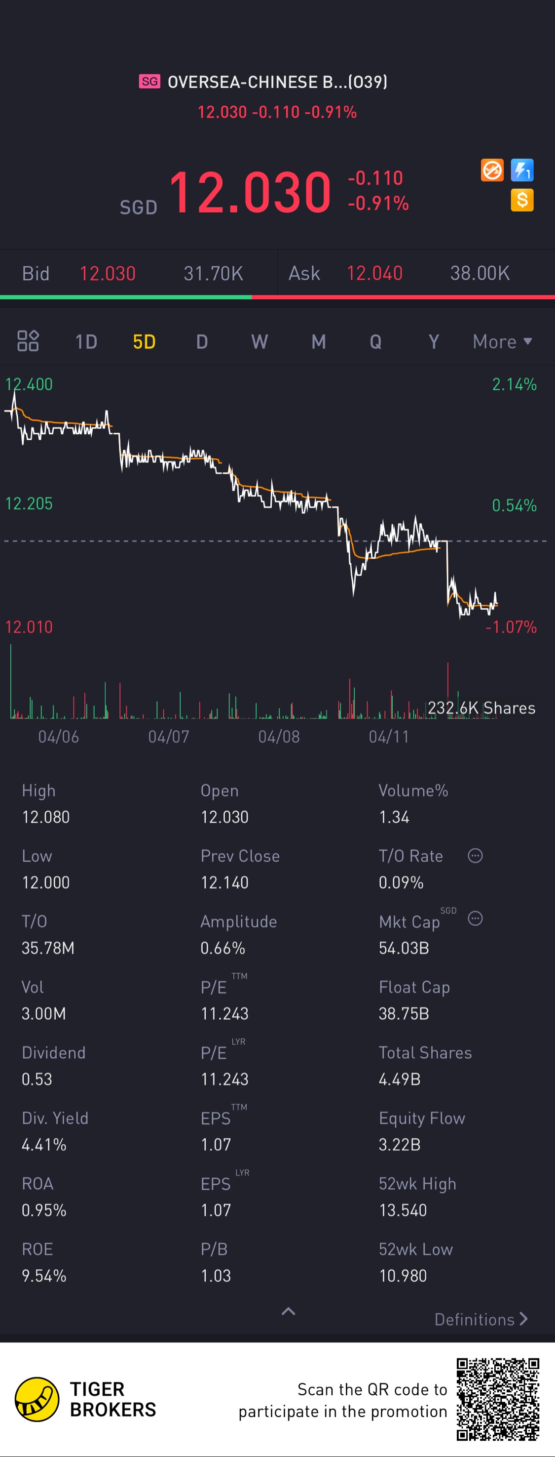 $OVERSEA-CHINESE BANKING CORP(O39.SI)$the current dip presents a good chance for those considering entering[Cool]