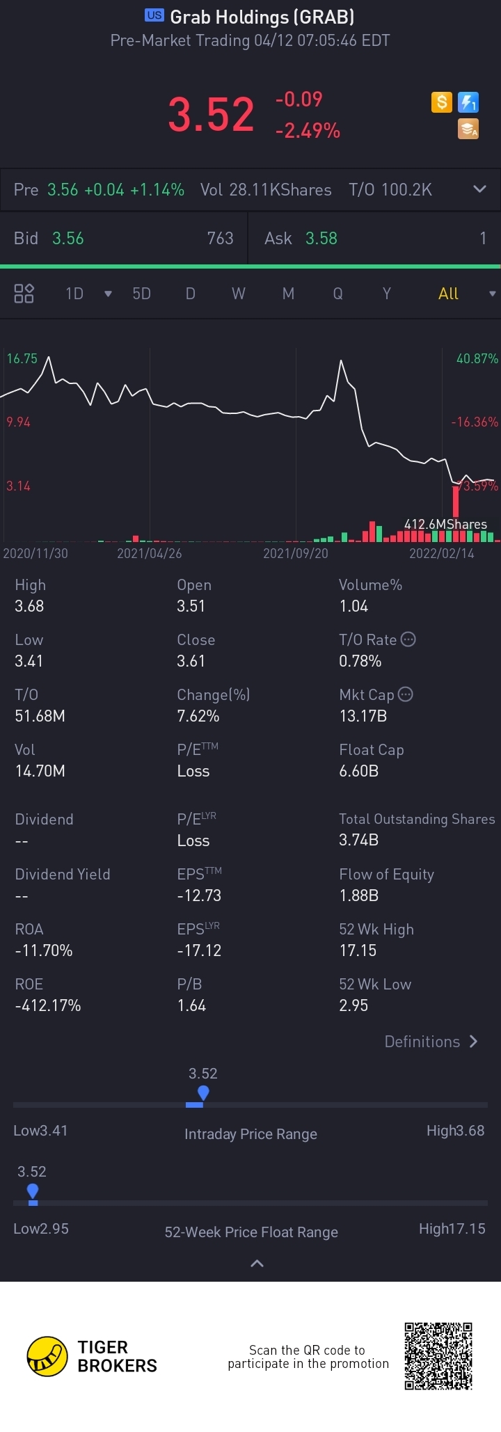 $Grab Holdings(GRAB)$This stock has been revolving around $3.40 - $3.60, might be good to buy for trading purposes.