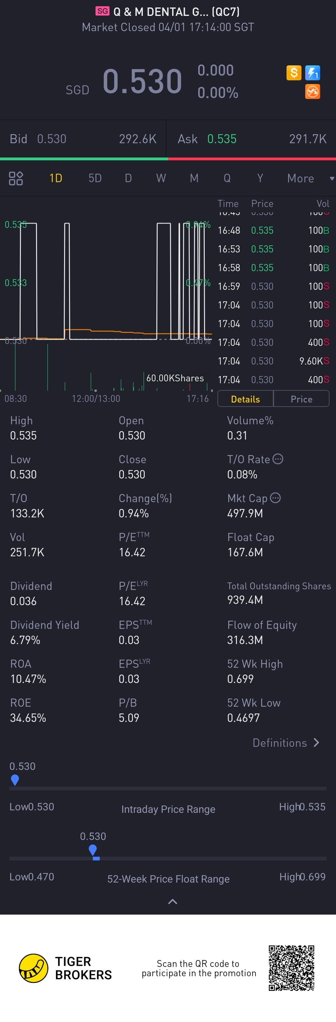 $Q & M DENTAL GROUP (S) LIMITED(QC7.SI)$ Good Dividend 6.79% Phillip Securities rated buy TP 0. 71