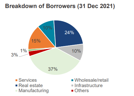 YZJFH customers for its debt investment business comprise SMEs, micro-enterprises, and individual proprietors. The below pie chart gives a breakdown of its borrowers in the various sectors as of 31 December 2021. The bulk of its borrowers are in the manufacturing sector, accounting for 37%, followed by real estate at 24% and the services sector, at 15%.