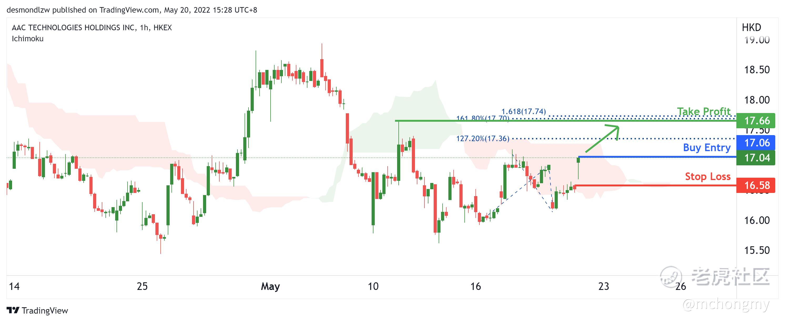 Price has just reversed the ichimoku cloud which supports my bullish bias. I will probably place my take profit at the second resistance level at 17.66 in line with the 161.8% fibonacci projection and 161.8% fibonacci extension.