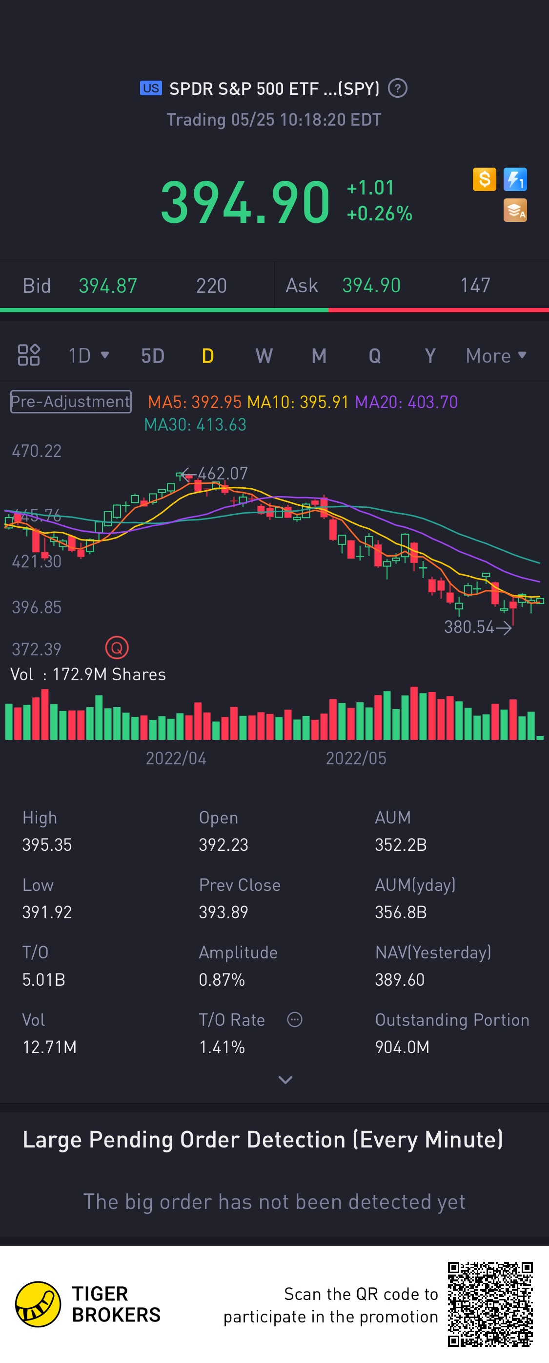 $SPDR S&P 500 ETF Trust(SPY)$Looks likea Green Day Today. And it looks like someone is avoiding the SPX500 to enter a bear market. I have huge conviction that the SPX500 won't close 20% from its high. And I also see people too fearful to buy predicting a recession coming. It is advisable to invest within your means and not to go on margin or leverage which your cash position cannot cover.