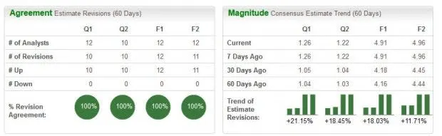 Analysts have been pushing their earnings estimates higher over the last 60 days with a 100% revision agreement across the board. For the upcoming quarter in August, the Consensus Estimate Trend has climbed 21%, reflecting quarterly earnings of $1.26 per share and a sizable 100% growth in EPS from the year-ago quarter.