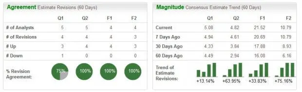 Analysts have been positively revising their earnings estimates across the board over the last 60 days, which is a very bullish signal. The $5.08 per share estimate for the upcoming quarter displays a substantial 50% expansion of the bottom line compared to the year-ago quarter.