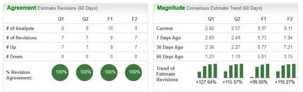 Over the last 60 days, analysts have been rapidly upping their earnings outlook across the board quite significantly. The Consensus Estimate Trend has increased a massive 127% for the upcoming quarter, reflecting earnings growth of a triple-digit 775% from the year-ago quarter.