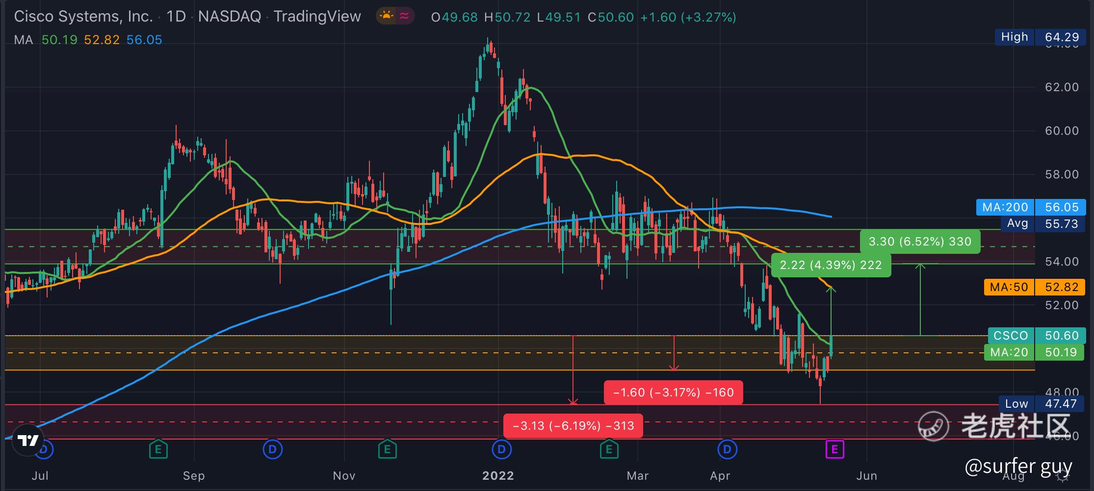 If earnings beat and CSCO provides positive forward guidance, price could rise to first target $52.82 (+4.39%) to 50MA trendline. Further upside would be price reaching bottom of higher price zone (green colour) around $53.91(+6.52%).