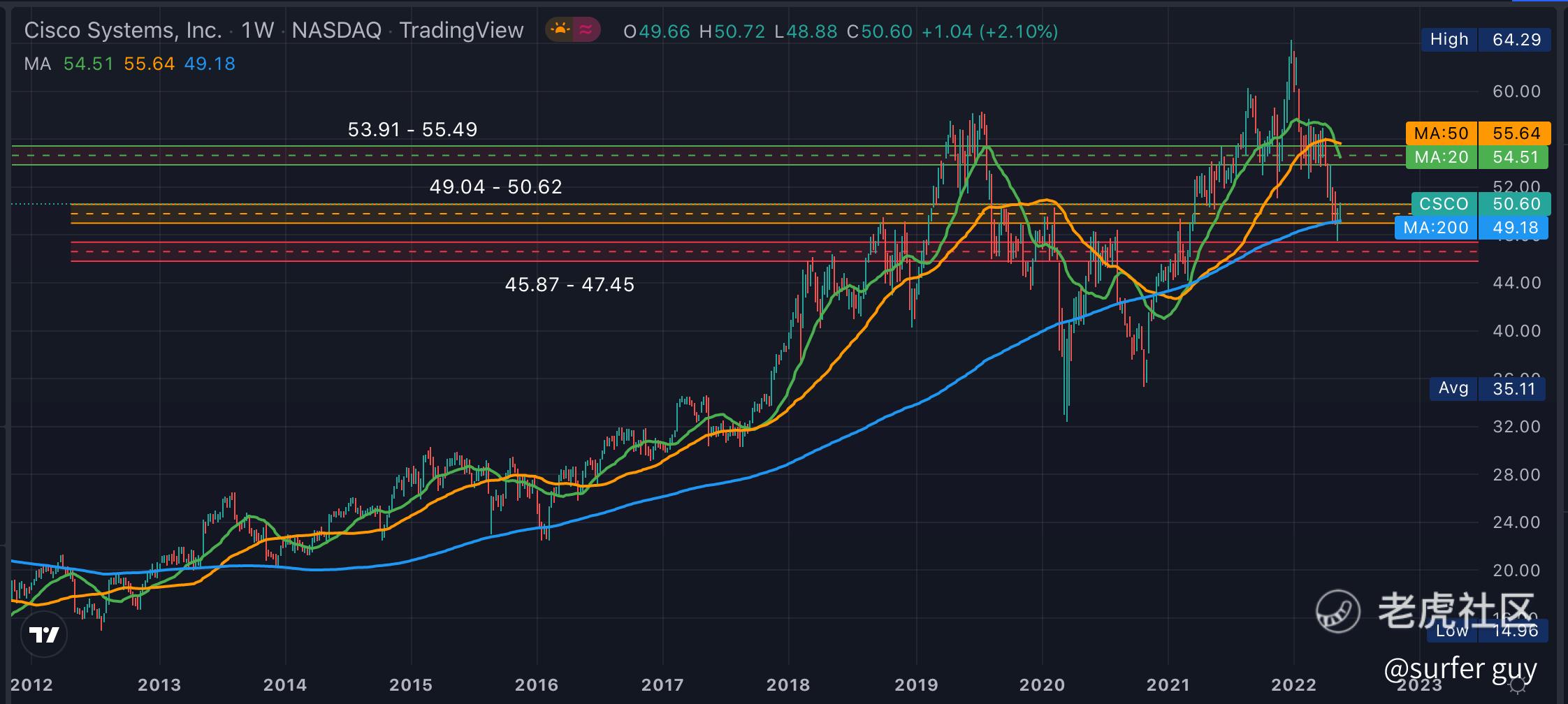Reviewing Weekly Chart of CSCO all the way back a decade to 2012, we can see price is on a long term uptrend until a double dip due to COVID-19 pandemic and triple-whammy inflation, rate hike and geopolitical crisis induced sell-off since start of 2022.