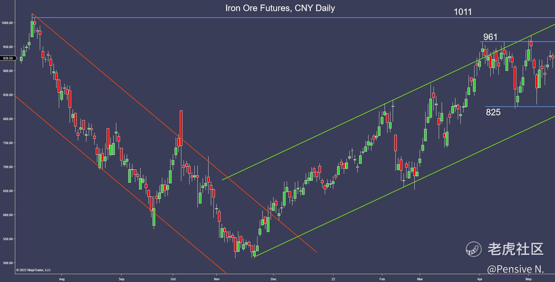 - Iron ore remains in its bullish channel, but remains stuck in a wide range between 825–961