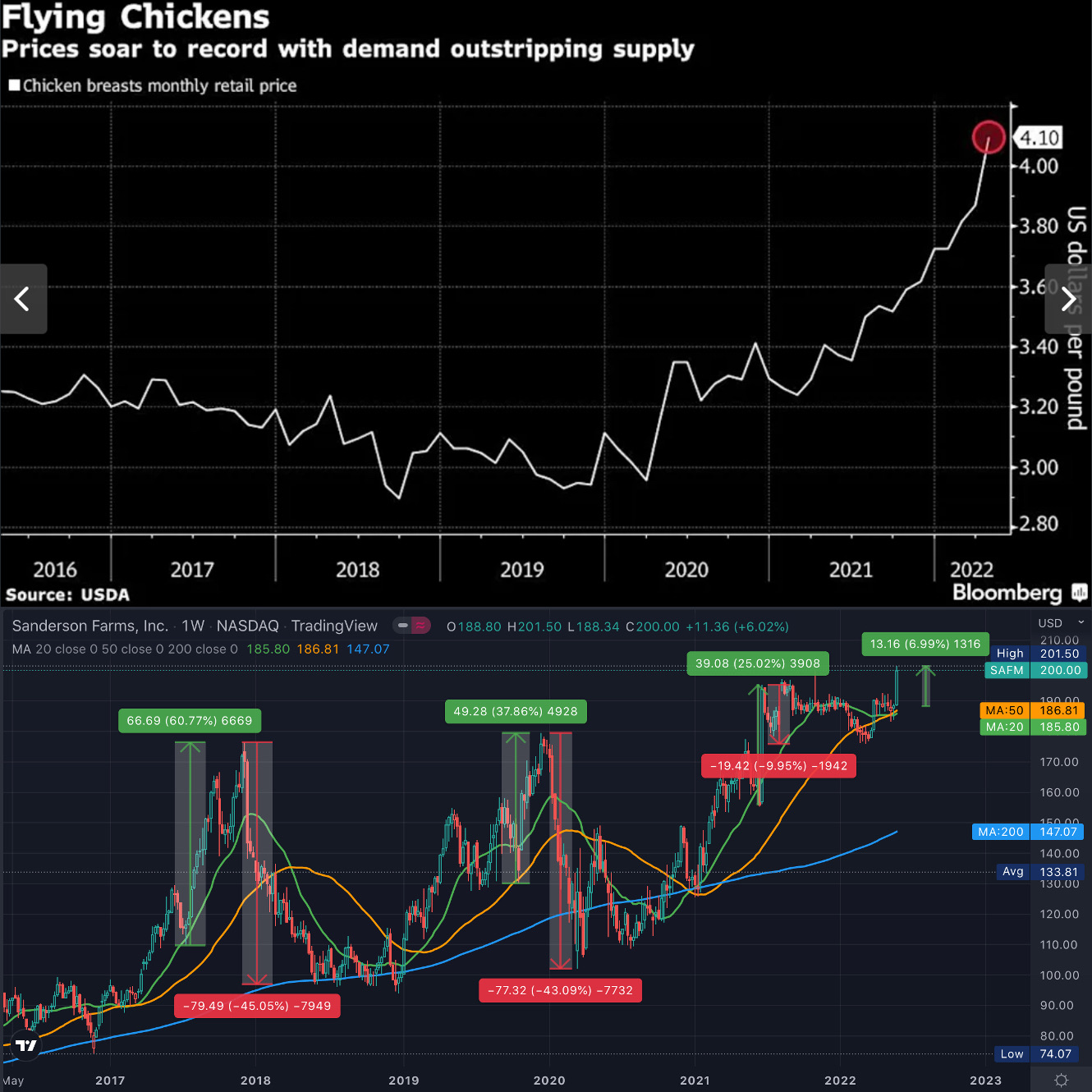 Last Fri May 27, the 3rd largest poultry producer in US, Sanderson Farm, Inc. $Sanderson Farms(SAFM)$reported revenue $1.54B (+36.3% Y/Y) and EPS $14.39 (+231.6% Y/Y), both stunning beat of expectations. I’s share price shot up 6.99% in one day.