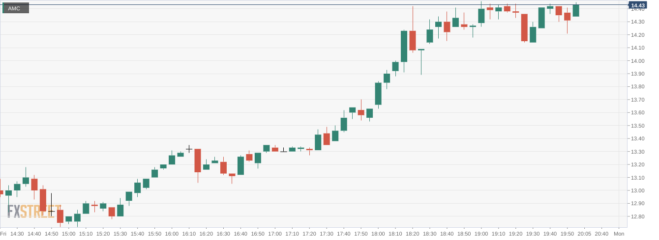 NYSE:AMC looked to be taking over the retail squeeze from its running mate GameStop (NYSE:GME) on Friday, as the movie theater stock soared into the weekend.Shares of AMC hit orbit, gaining 17.99% and closed the trading week at $14.43.Stocks rose for the third straight session as US markets posted their best overall week since November of 2020. The gains also marked the end to the seven-week losing streak from the major indices. The Dow Jones added 575 basis points while the S&P 500 and NASDAQ rose by 2.47% and 3.33% respectively during the session.