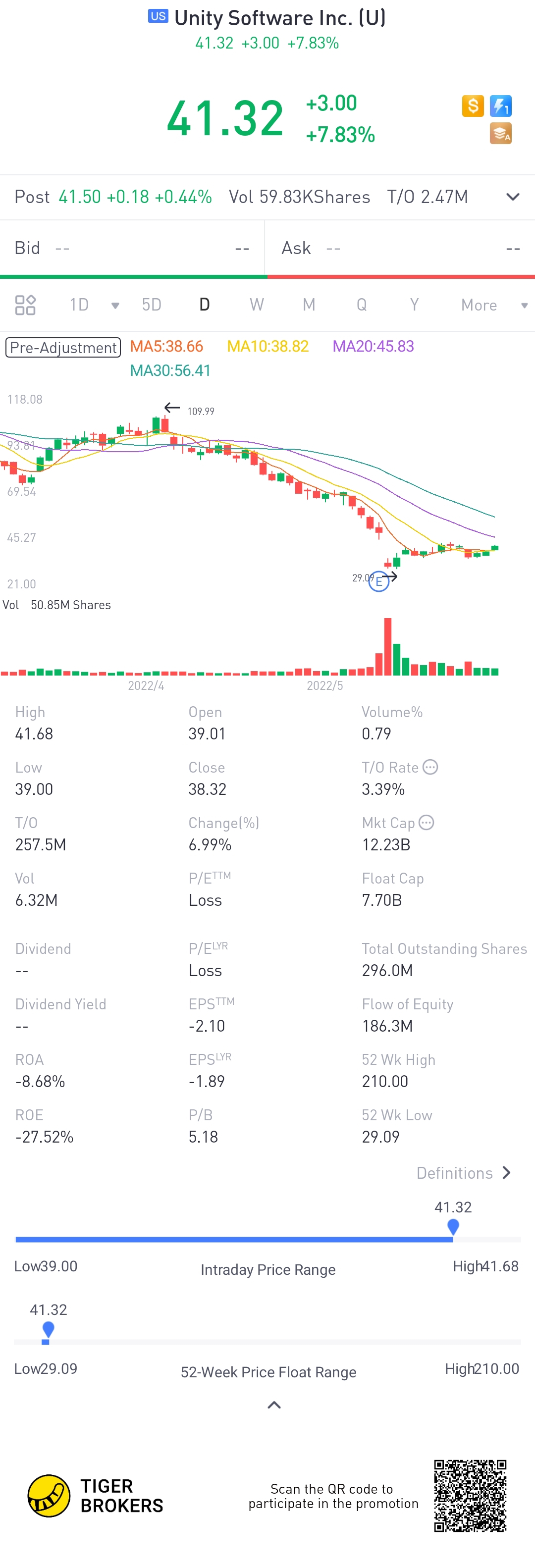 $Unity Software Inc.(U)$at real-time 3D platform with its price at a huge discount. In the past year, the price was over 210...and now standing at about 1/5 of its peak. Will you add this to your portfolio?