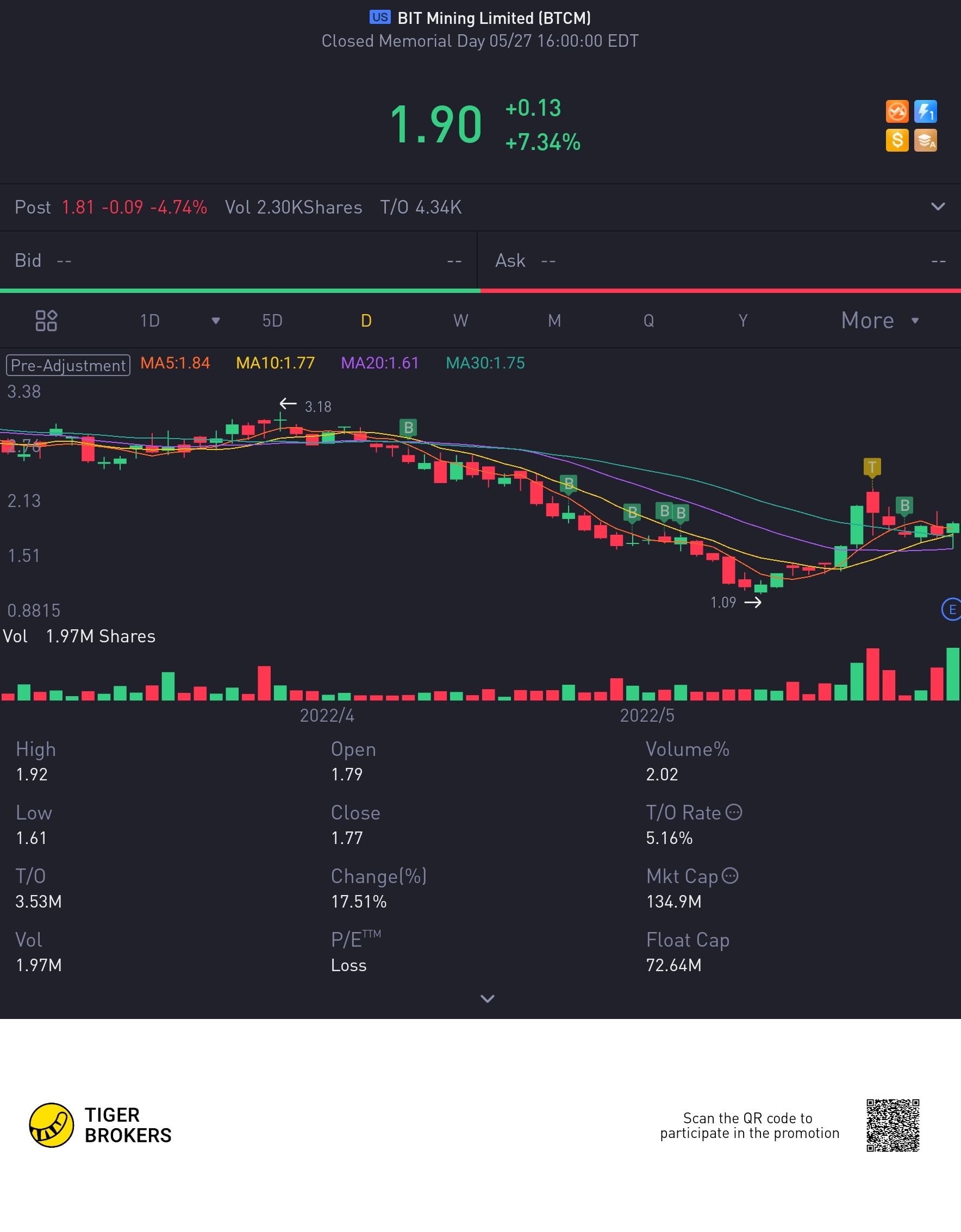 $BIT Mining Limited(BTCM)$bouncing back ...