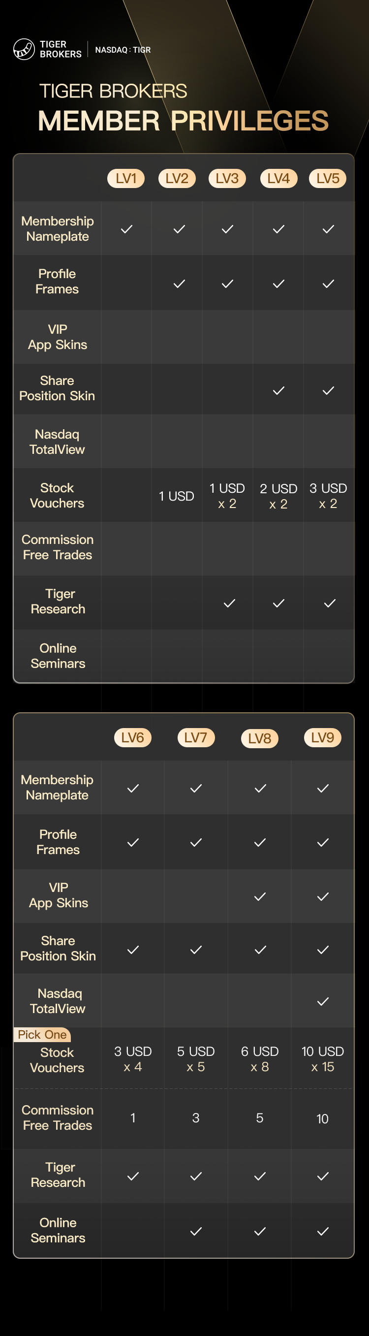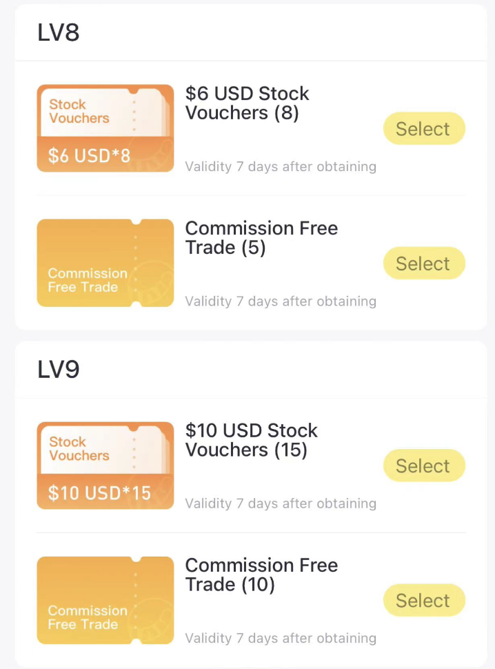 The corresponding free card and voucher can also be renewed. But if your growth goes up, the membership level will be updated.For example, if you have LV5 growth in January, you can receive the LV5 benefits. In April, when the benefit level is recalculated, you are still LV5. In addition to other functional privileges, you can receive LV5 benefits again - two stock vouchers of 3 USD. If you had a LV4 in January and a LV5 in February, you can get a LV4 in January and another LV5 in February